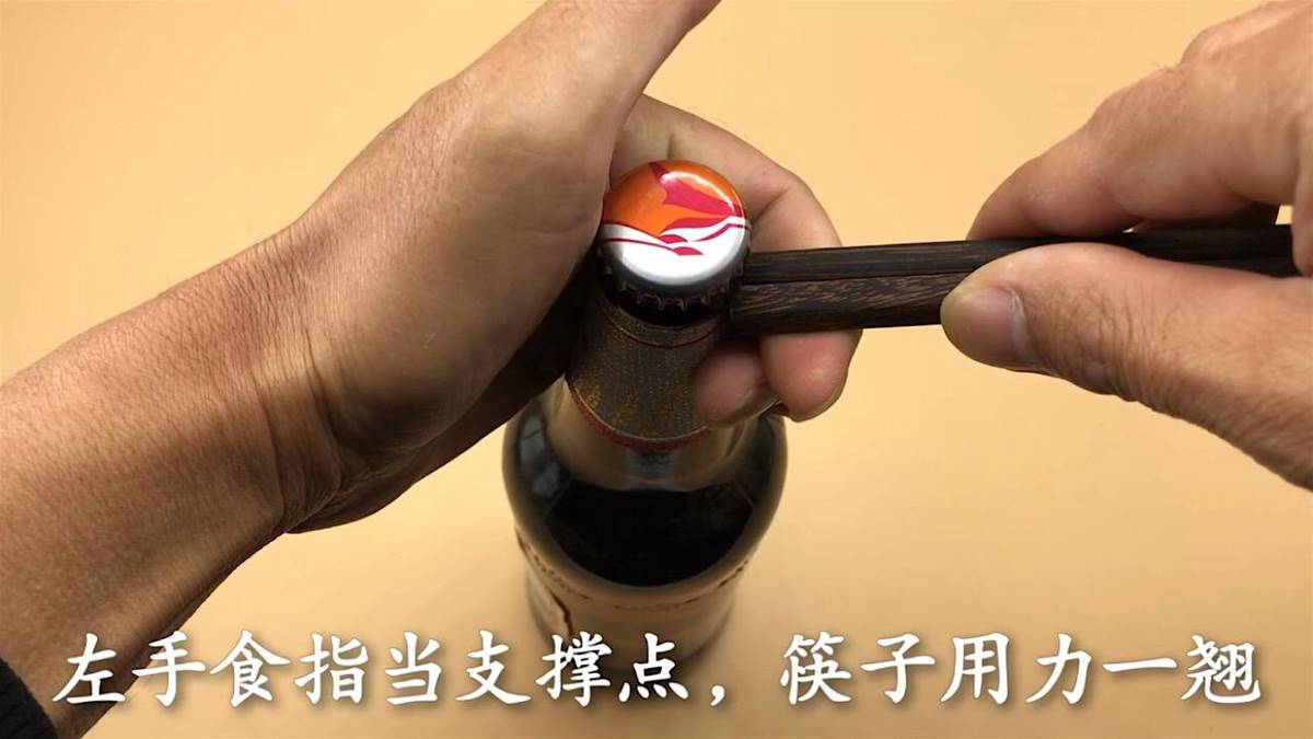 利用筷子粗的一頭,左手握住啤酒,右手拿住筷子粗的那頭,左手食指當支撐點,筷子用力一翹,這樣啤酒瓶蓋就能輕松打開了。
